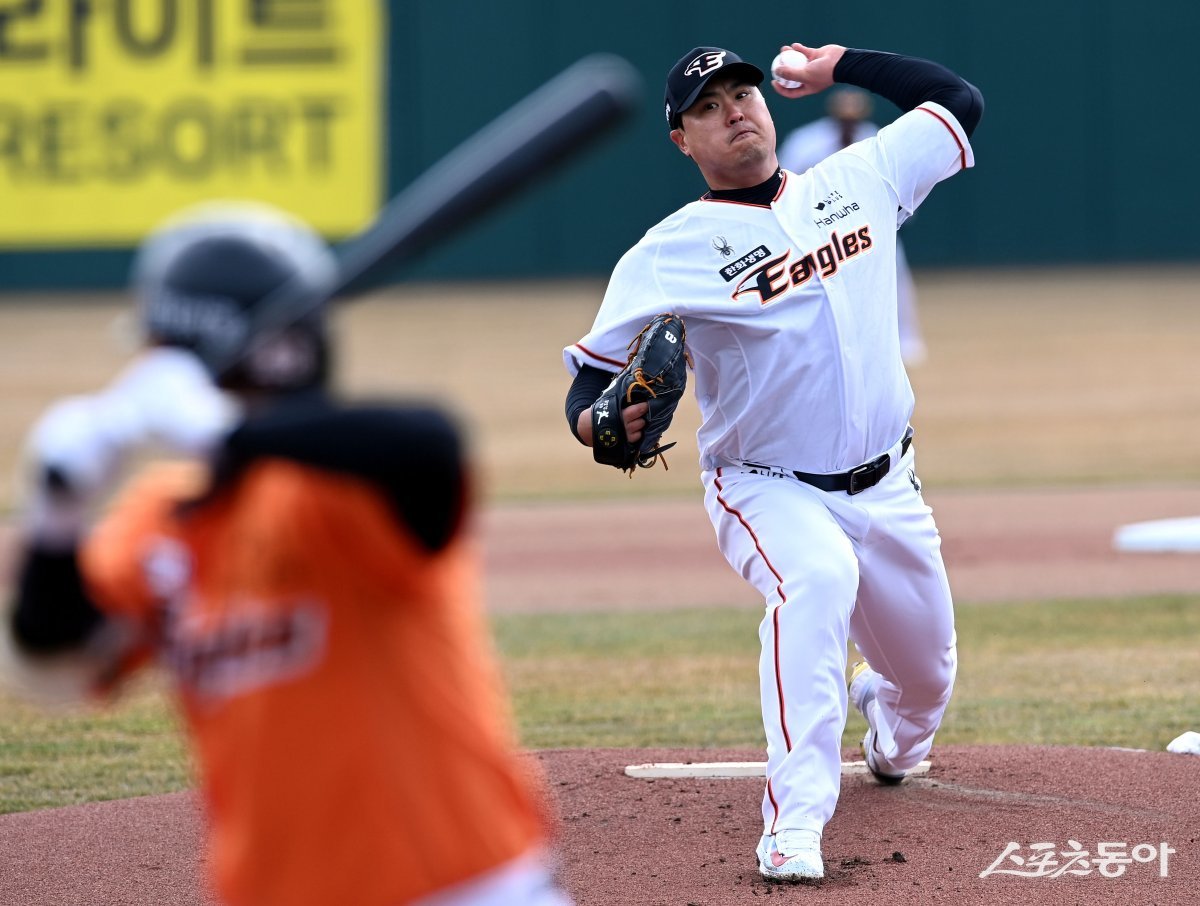 7일 대전 한화생명이글스파크에서 한화 이글스의 청백전 연습 경기가 열렸다. 한화 선발투수 류현진이 힘차게 볼을 던지고 있다.