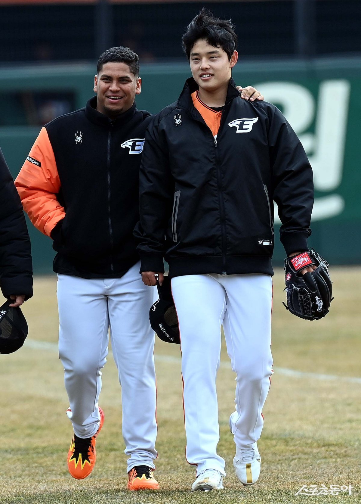 7일 대전 한화생명이글스파크에서 한화 이글스의 청백전 연습 경기가 열렸다. 한화 산체스와 문동주가 경기를 준비하고 있다.
