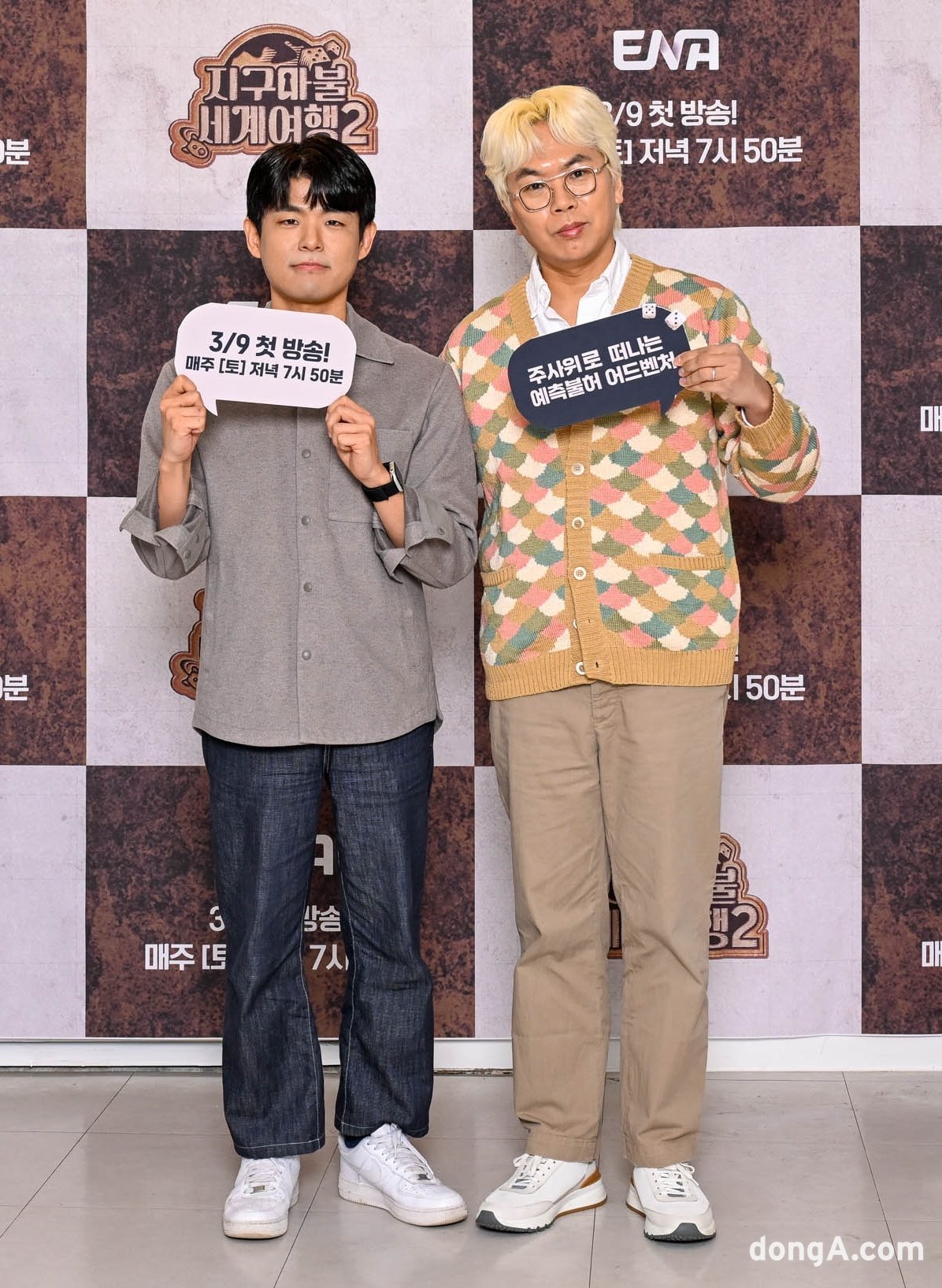 김훈범PD와 김태호PD가 7일 오후 서울 서대문구의 한 카페에서 진행된 ENA와 TEO의 예능 프로젝트 ‘지구마불 세계여행2’ 제작발표회에서 포즈를 취하고 있다.