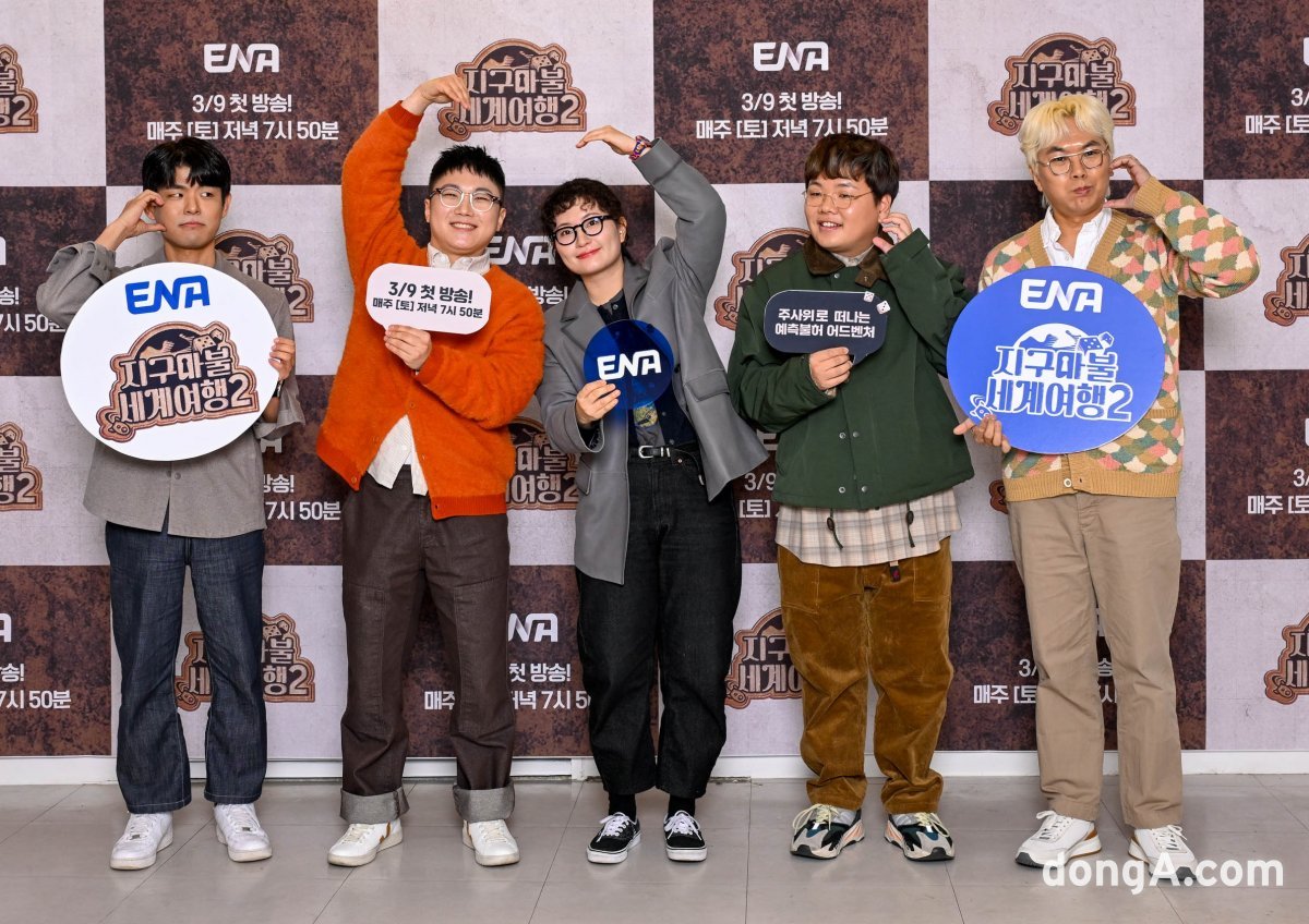 김훈범PD, 빠니보틀, 원지, 곽튜브, 김태호PD가 7일 오후 서울 서대문구의 한 카페에서 진행된 ENA와 TEO의 예능 프로젝트 ‘지구마불 세계여행2’ 제작발표회에서 포즈를 취하고 있다.
