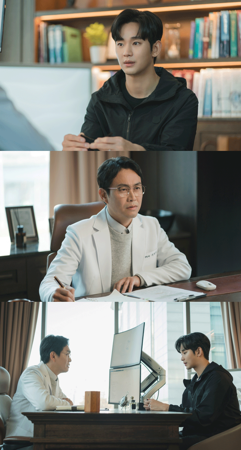 이런 가운데 공개된 사진 속에는 정체가 탄로 날까 선글라스에 모자까지 뒤집어쓰고 병원 상담실을 찾은 백현우(김수현 분)와 그런 그의 이야기를 진지하게 듣고 있는 의사(오정세 분)의 모습이 포착돼 이목을 집중시킨다. 과연 완벽해 보이는 재벌 사위 백현우가 남들의 눈을 피해 병원을 찾은 이유는 무엇일지 궁금해진다.