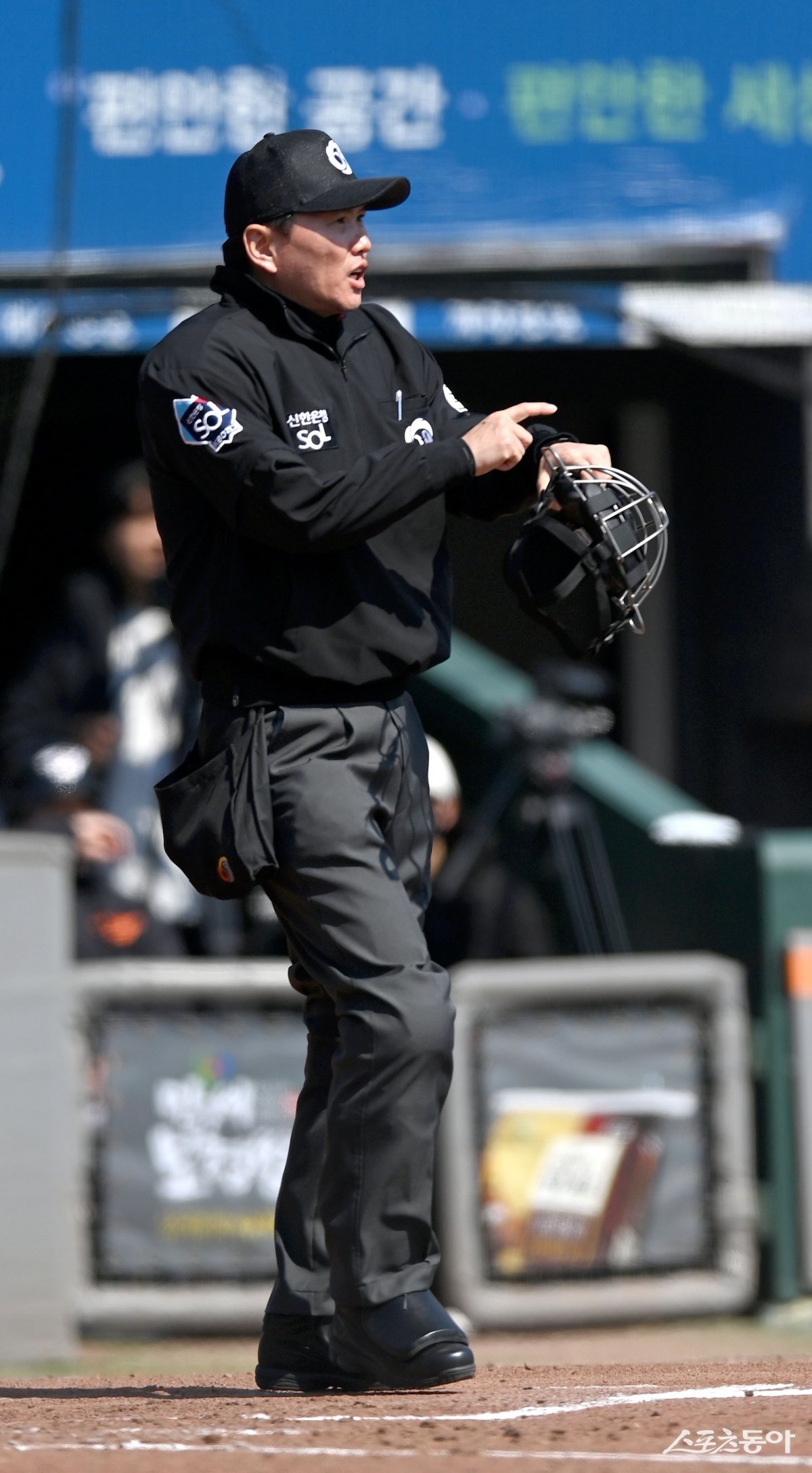10일 대전 한화생명이글스파크에서 ‘2024 신한은행 SOL Bank KBO리그’ 시범경기 삼성 라이온즈와 한화 이글스 열렸다. 2회초 2사 1,3루 권영철 주심이 피치클락 경고를 주고 있다.