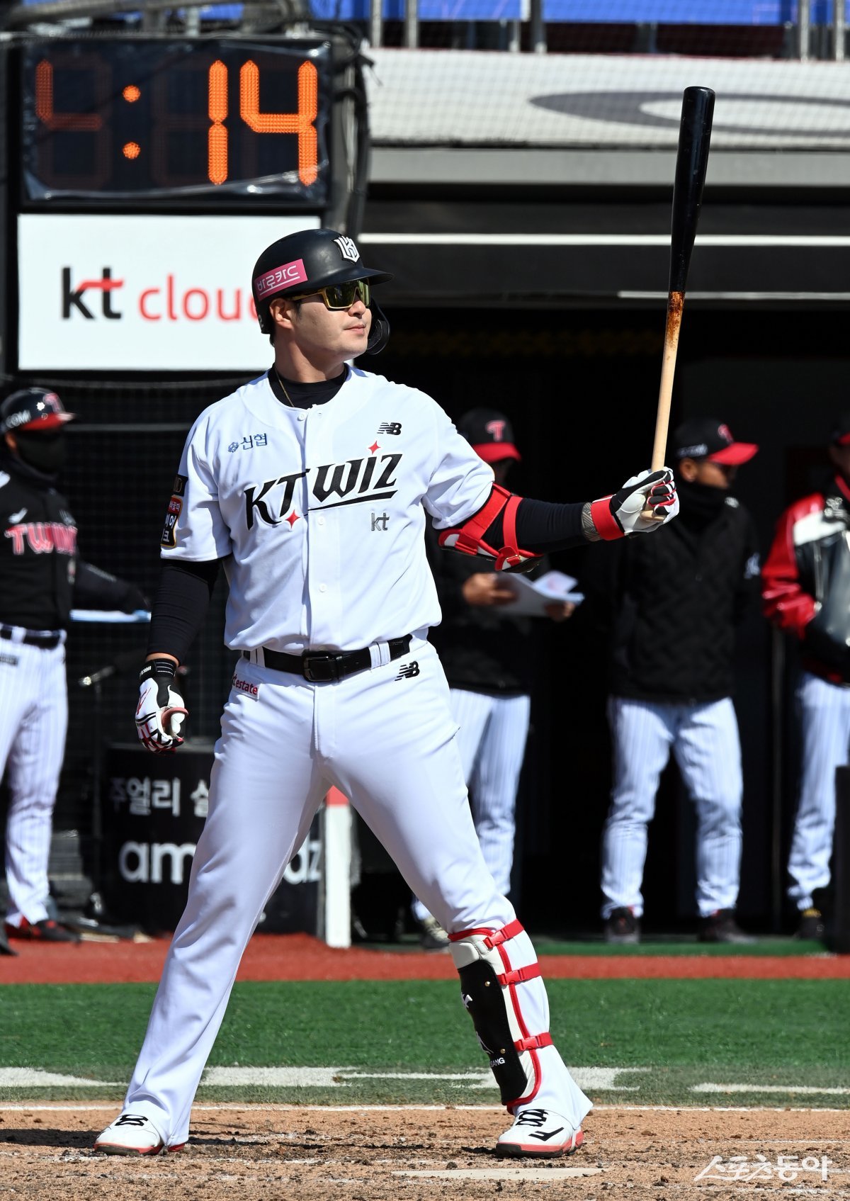 10일 경기도 수원 KT위즈파크에서 ‘2024 신한 SOL 뱅크 KBO리그’ KT 위즈와 LG 트윈스의 시범경기가 열렸다. KT 박병호가 타석에 들어서자 피치클락이 작동하고 있다.