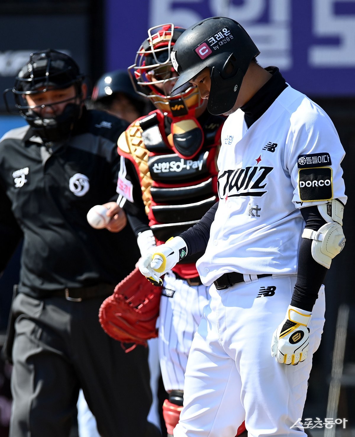 10일 경기도 수원 KT위즈파크에서 ‘2024 신한 SOL 뱅크 KBO리그’ KT 위즈와 LG 트윈스의 시범경기가 열렸다. 2회말 1사 1, 3루에서 KT 배정대가 투구에 맞은 후 고통을 호소하고 있다.