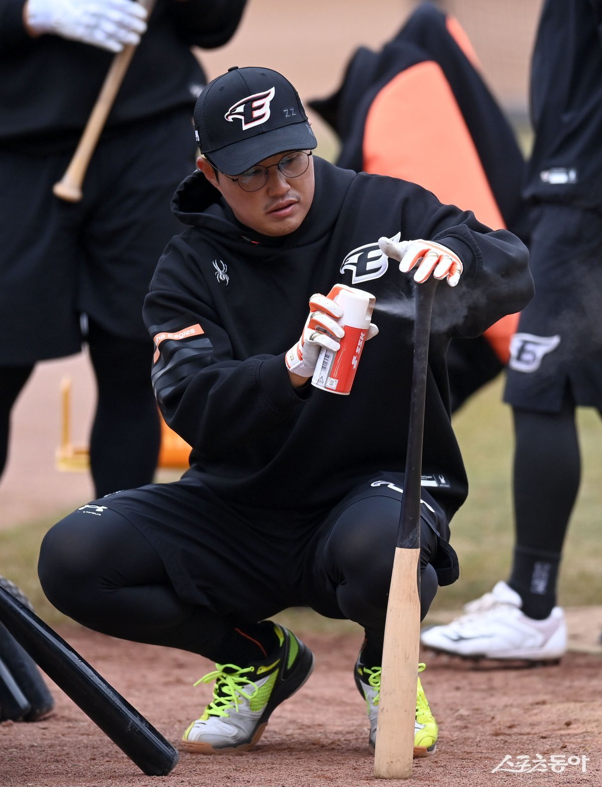 12일 대전 한화생명이글스파크에서 ‘2024 신한은행 SOL Bank KBO리그’ 시범경기 KIA 타이거즈와 한화 이글스 열린다. 채은성이 훈련 중 배트에 그립 스프레이를 뿌리고 있다.