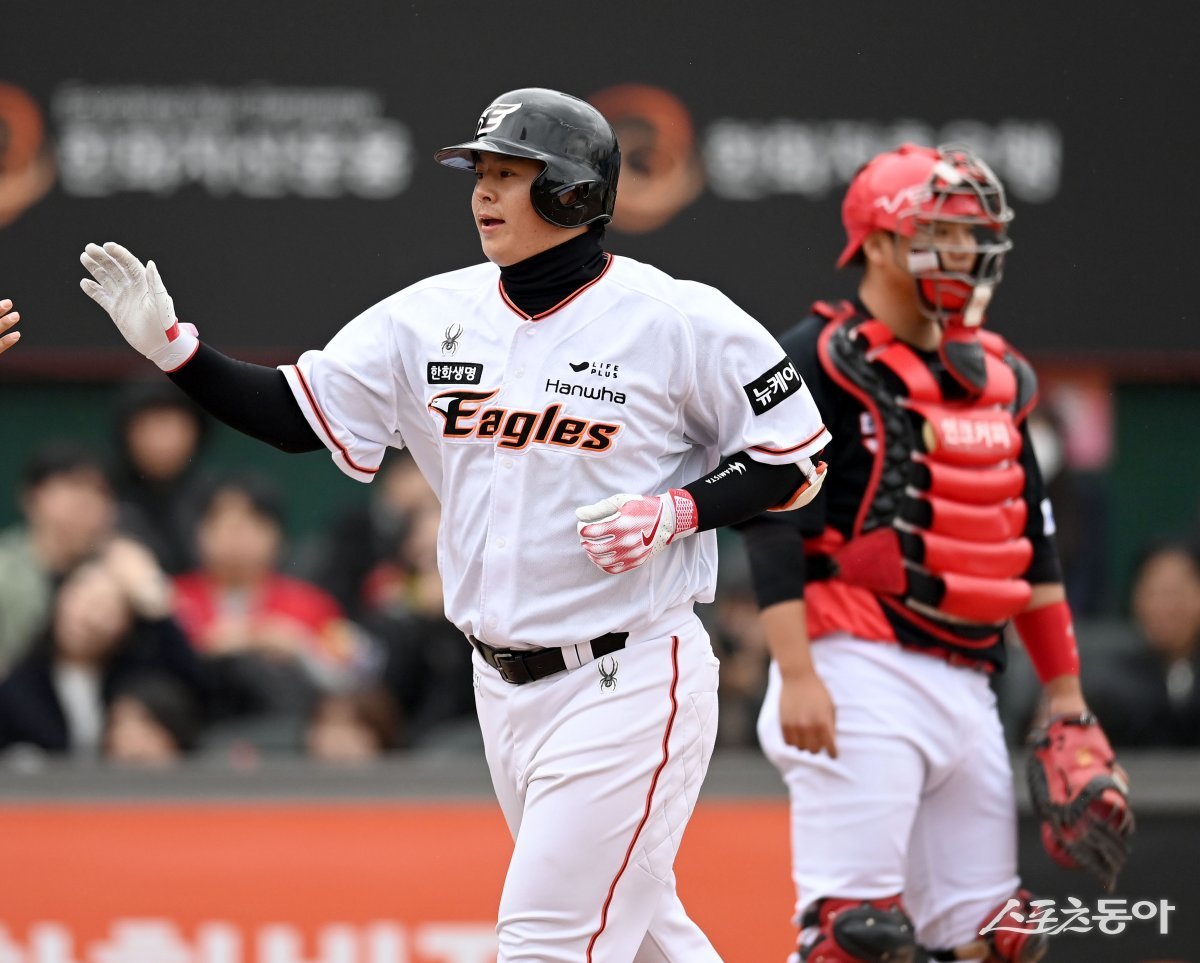 12일 대전 한화생명이글스파크에서 ‘2024 신한은행 SOL Bank KBO리그’ 시범경기 KIA 타이거즈와 한화 이글스 열렸다. 1회말 1사 1,2루 한화 노시환이 우월 스리런 홈런을 날린 후 그라운드를 돌아 홈인해 하이파이브 바고 있다.