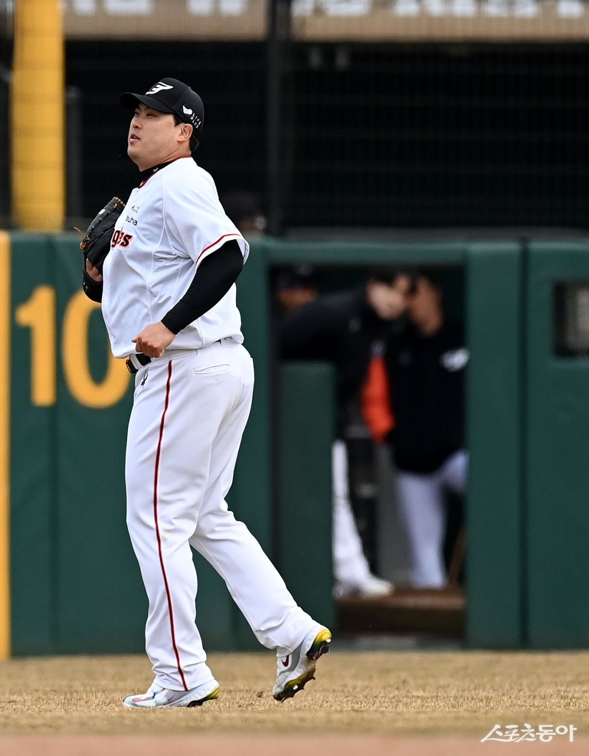 12일 대전 한화생명이글스파크에서 ‘2024 신한은행 SOL Bank KBO리그’ 시범경기 KIA 타이거즈와 한화 이글스 열렸다. 선발로 등판해 4이닝 투구를 마친 한화 류현진이 불펜투구장으로 가고 있다.