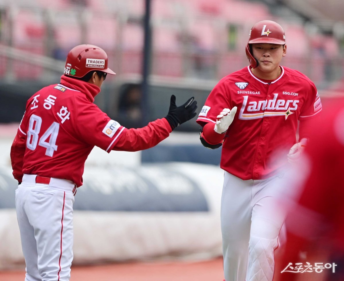 12일 수원KT위즈파크에서 열린 ‘2024 신한 SOL 뱅크 KBO리그’ KT 위즈와 SSG 랜더스의 시범경기에서 1회초 1사 SSG 전의산이 좌월 솔로 홈런을 친 후 3루 코치와 기쁨을 나누고 있다.