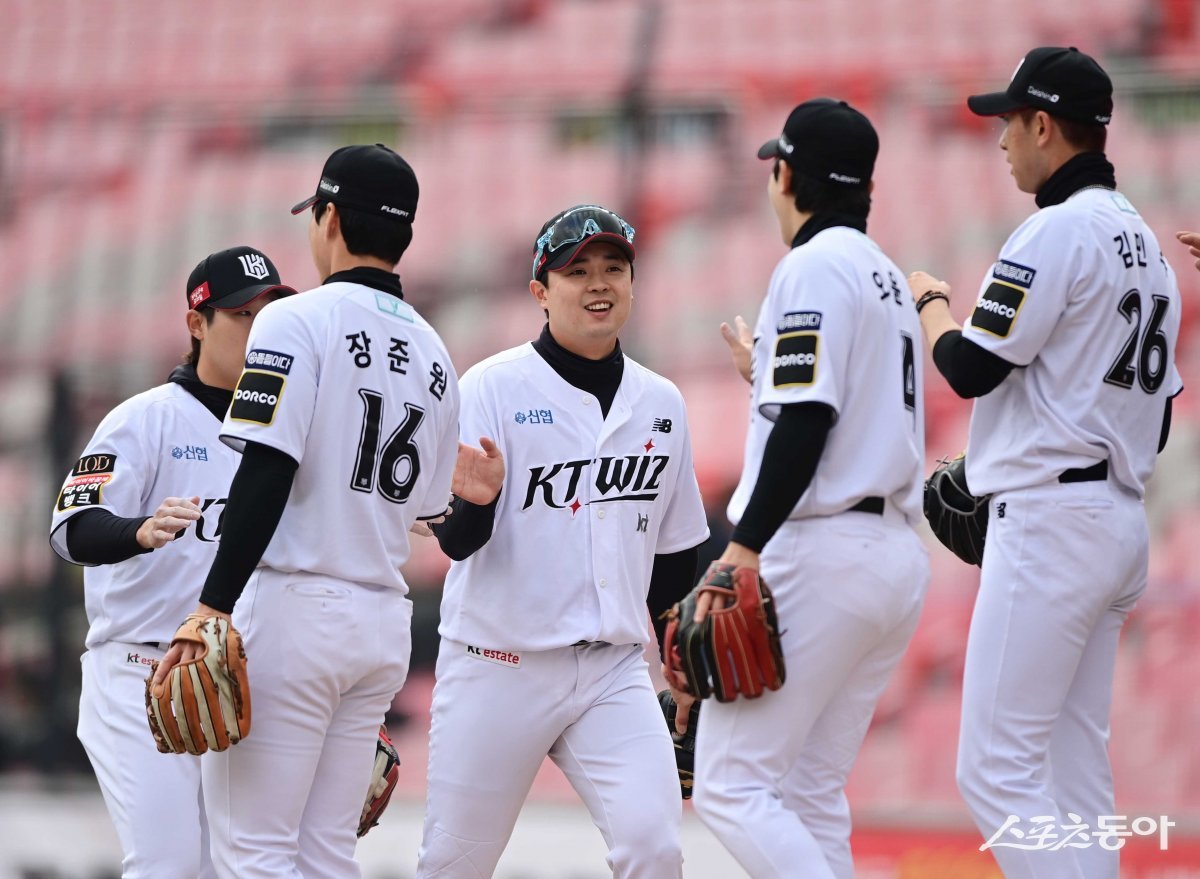 12일 수원KT위즈파크에서 열린 ‘2024 신한 SOL 뱅크 KBO리그’ KT 위즈와 SSG 랜더스의 시범경기에서 8-4로 승리한 KT 선수들이 기쁨을 나누고 있다.