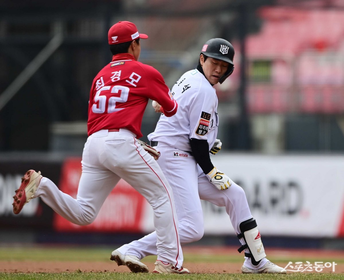 12일 수원KT위즈파크에서 열린 ‘2024 신한 SOL 뱅크 KBO리그’ KT 위즈와 SSG 랜더스의 시범경기에서 1회말 2사 2, 3루 KT 오윤석이 역전 2타점 중전 적시타를 친 후 SSG 유격수에게 태그 아웃당하고 있다.