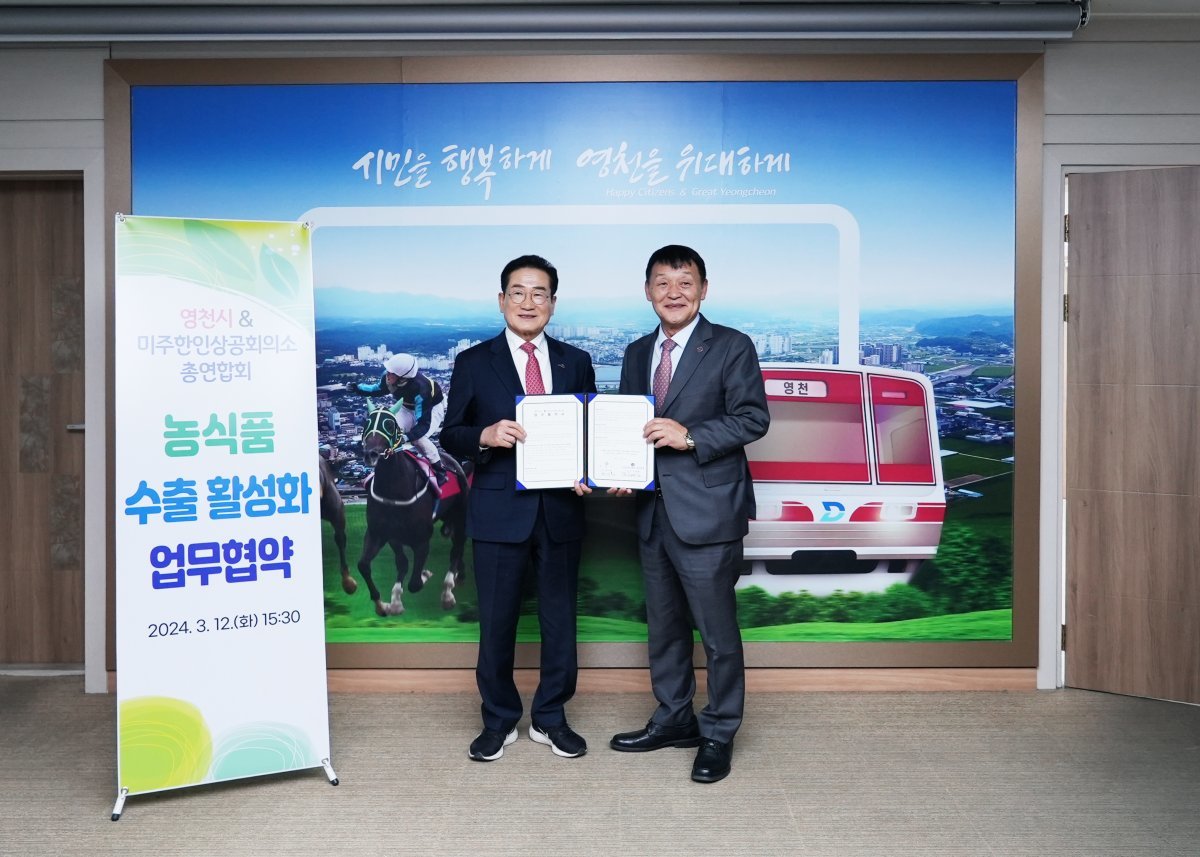 영천시는 12일 시청에서 미주 한인상공회의소 총연합회 회장단 일행을 접견하고 미국 시장 진출 확대를 위한 업무협약을 체결했다.이번 협약은 영천시 우수 농특산물의 미주 수출 확대를 위한 교류와 협력을 강화하는 내용을 담고 있다.