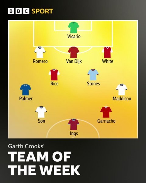 미드필더 네 자리는 제임스 매디슨(토트넘), 존 스톤스(맨체스터 시티), 데클런 라이스(아스널), 콜 팔머(첼시)가 차지했고, 수비수로는 크리스티안 로메로(토트넘), 버질 판데이크(리버풀), 벤 화이트(아스널)가 뽑혔다.