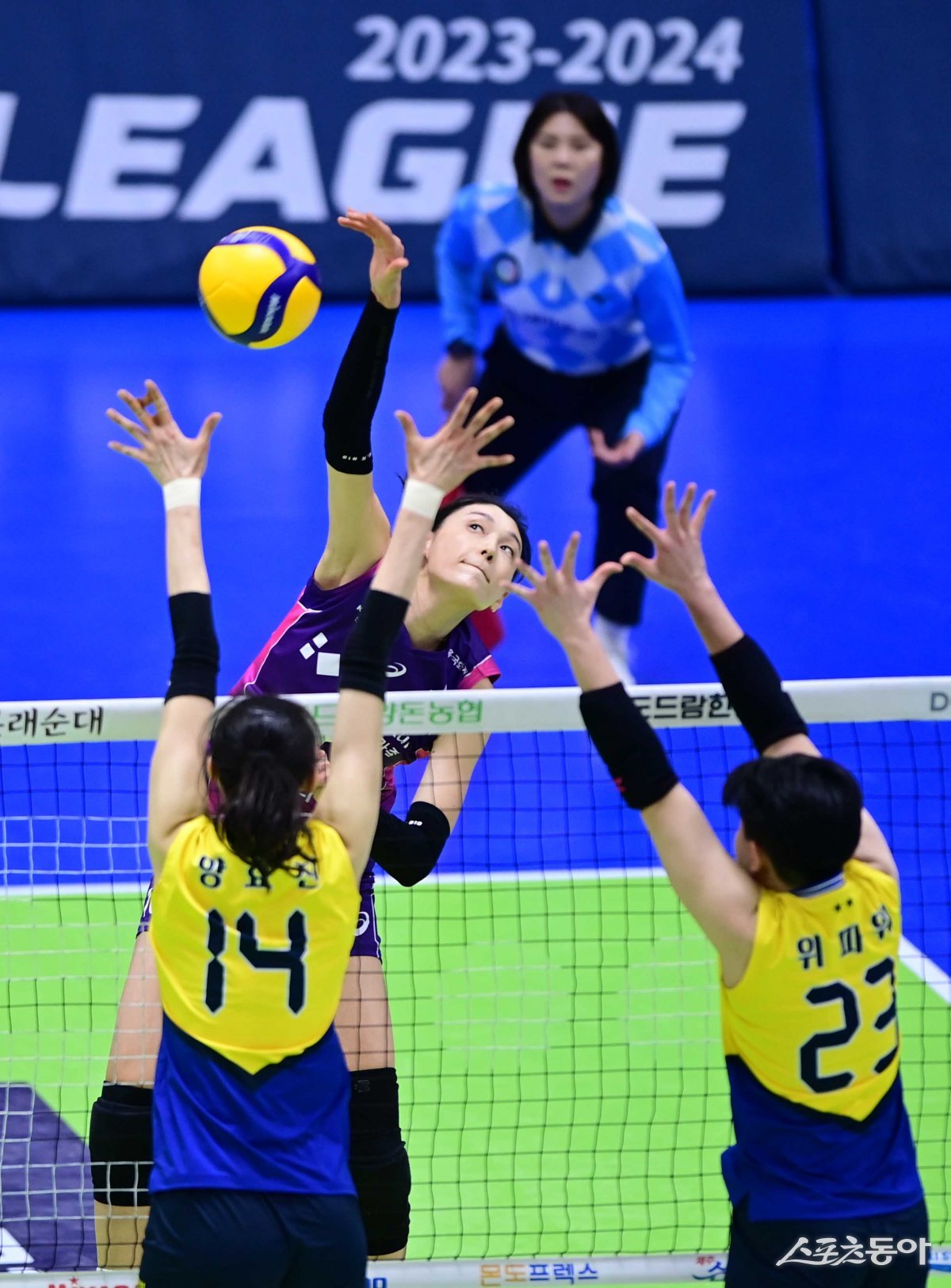 12일 경기도 수원체육관에서 열린 ‘도드람 2023-2024 V리그’ 여자부 수원 현대건설과 인천 흥국생명의 경기에서 흥국생명 김연경이 현대건설 블로커 앞에서 스파이크를 하고 있다.
