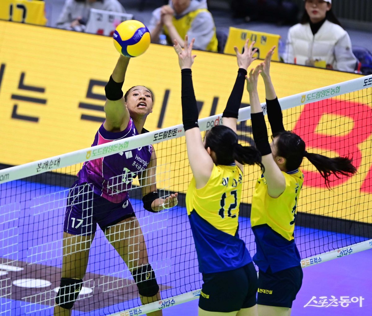 12일 경기도 수원체육관에서 열린 ‘도드람 2023-2024 V리그’ 여자부 수원 현대건설과 인천 흥국생명의 경기에서 흥국생명 레이나가 현대건설 블로커 앞에서 스파이크를 하고 있다.