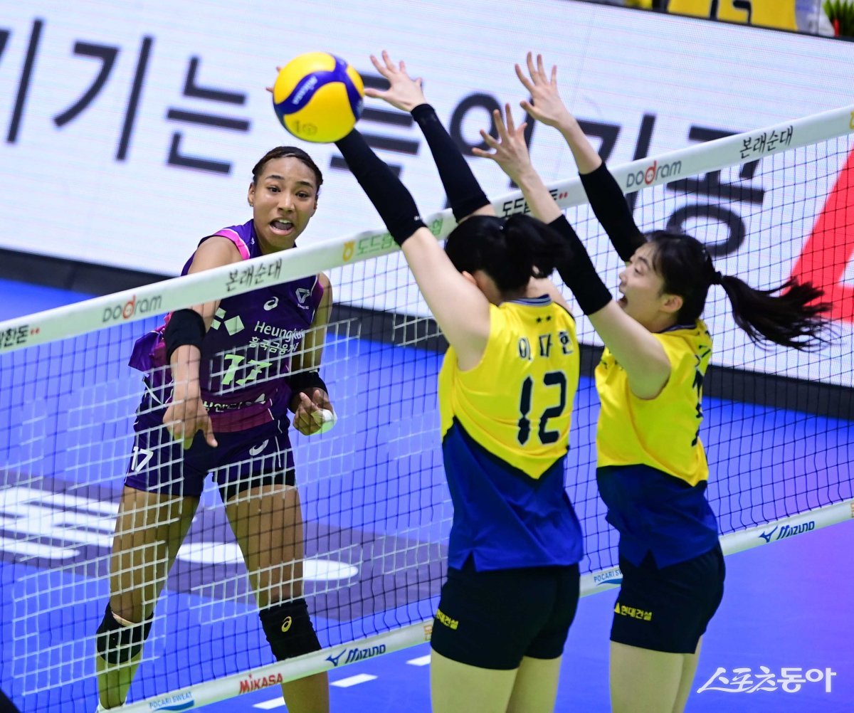 12일 경기도 수원체육관에서 열린 ‘도드람 2023-2024 V리그’ 여자부 수원 현대건설과 인천 흥국생명의 경기에서 흥국생명 레이나가 현대건설 블로커 앞에서 스파이크를 하고 있다.