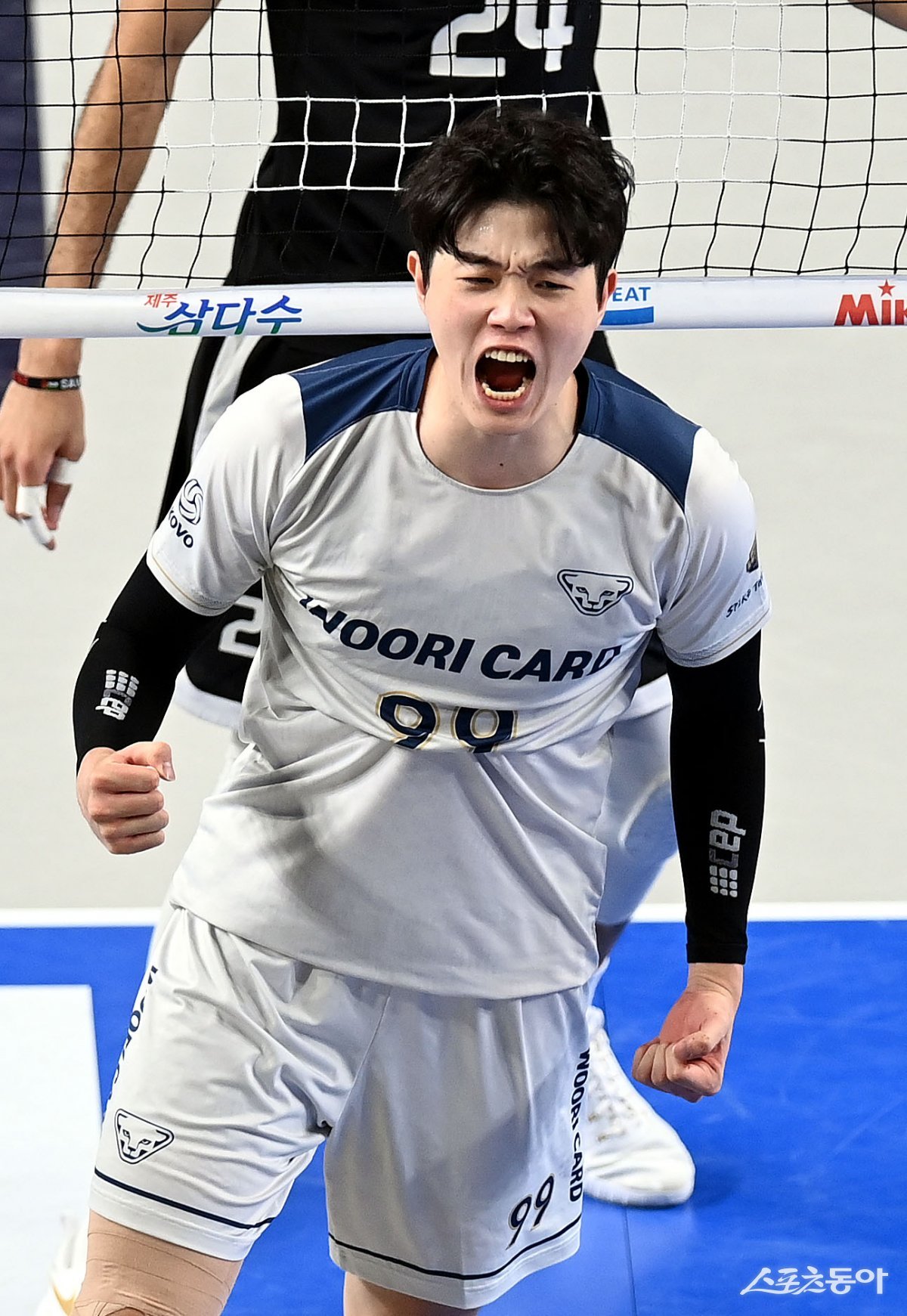 12일 충남 천안유관순체육관체육관에서 ‘2023-2024 도드람 V리그’ 천안 현대캐피탈과 서울 우리카드 남자부 경기가 열렸다. 우리카드 김지한이 득점을 올린 후 환호하고 있다.