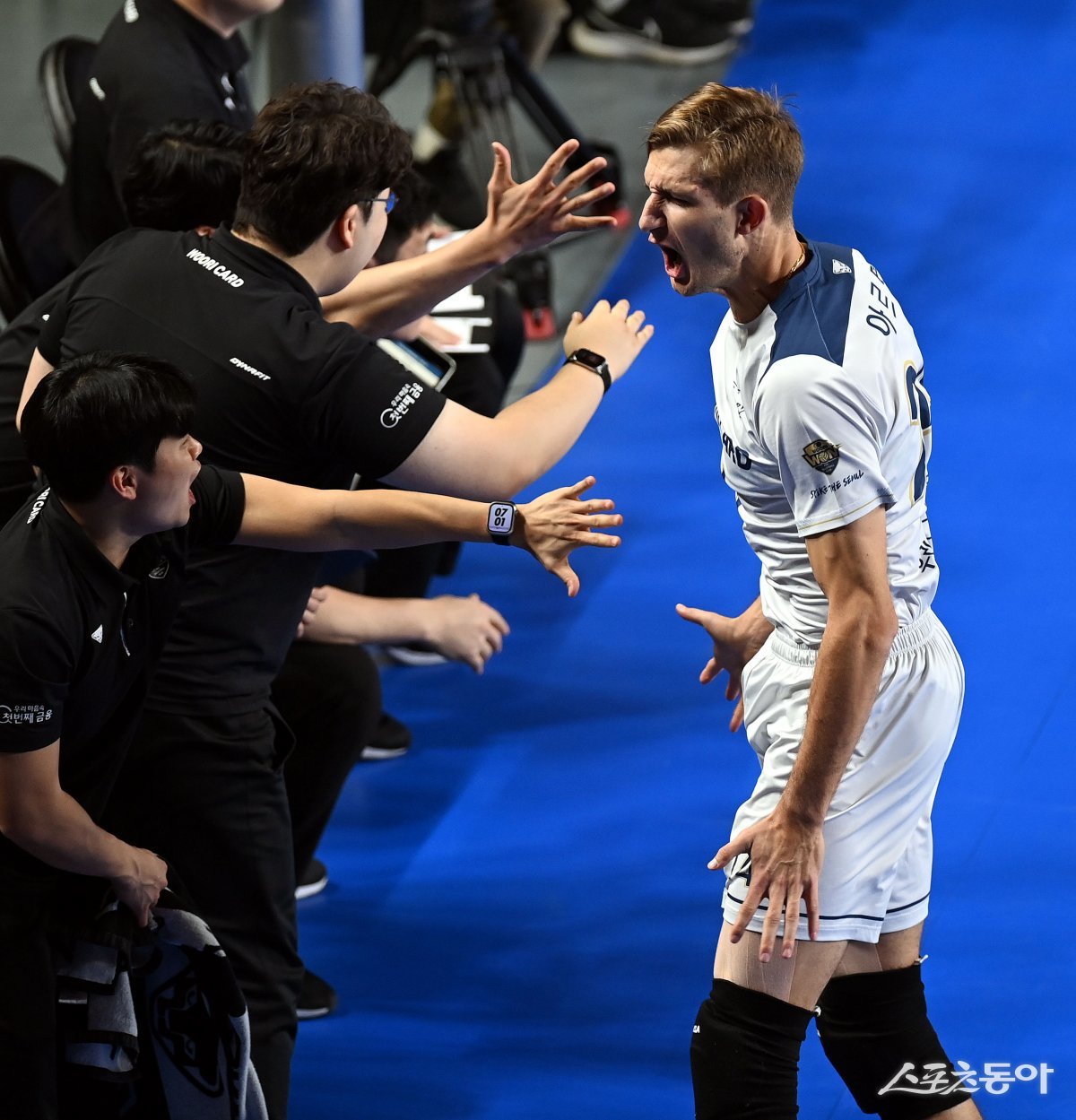 12일 충남 천안유관순체육관체육관에서 ‘2023-2024 도드람 V리그’ 천안 현대캐피탈과 서울 우리카드 남자부 경기가 열렸다. 우리카드 아르템이 득점을 올린 후 환호하고 있다.