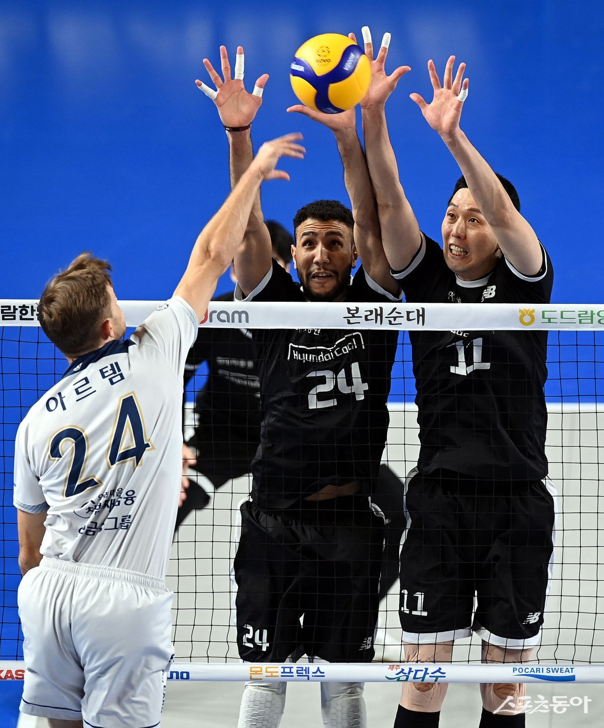 12일 충남 천안유관순체육관체육관에서 ‘2023-2024 도드람 V리그’ 천안 현대캐피탈과 서울 우리카드 남자부 경기가 열렸다. 현대캐피탈 아흐메드와 최민호가 우리카드 공격을 블로킹하고 있다.