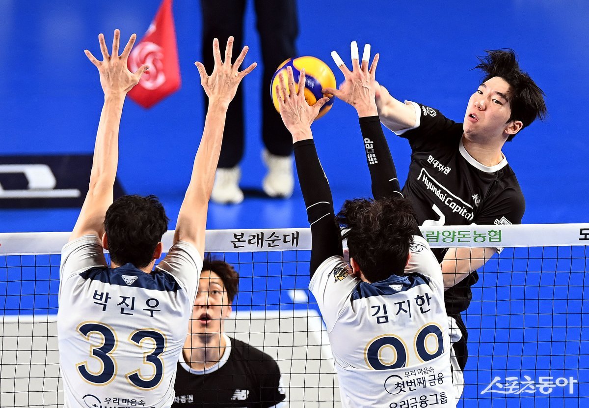 12일 충남 천안유관순체육관체육관에서 ‘2023-2024 도드람 V리그’ 천안 현대캐피탈과 서울 우리카드 남자부 경기가 열렸다. 현대캐피탈 허수봉이 우리카드 블로커를 피해 스파이크를 날리고 있다.