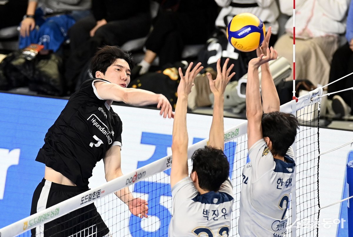 12일 충남 천안유관순체육관체육관에서 ‘2023-2024 도드람 V리그’ 천안 현대캐피탈과 서울 우리카드 남자부 경기가 열렸다. 현대캐피탈 허수봉이 우리카드 블로커를 피해 스파이크를 날리고 있다.