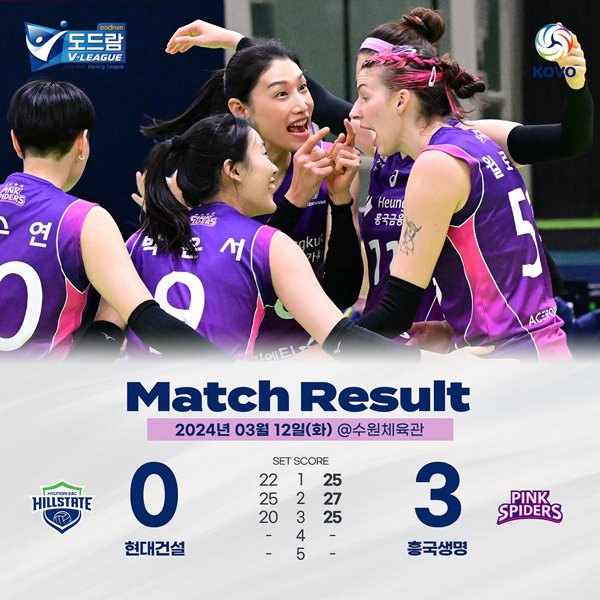 흥국생명은 12일 경기도 수원체육관에서 열린 2023~2024시즌 도드람 V리그 여자부 6라운드 현대건설과의 정규리그 마지막 맞대결에서 세트스코어 3-0(25-22, 27-25, 25-20)으로 완승했다.
