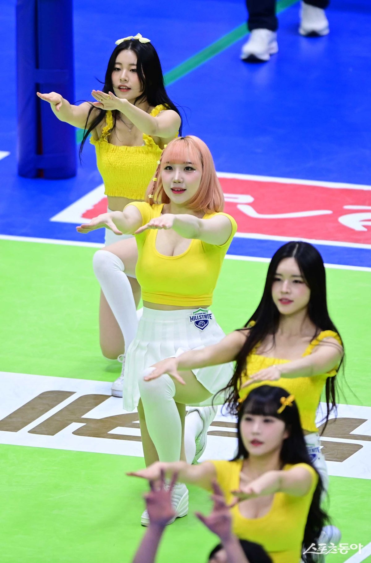 12일 경기도 수원체육관에서 열린 ‘도드람 2023-2024 V리그’ 여자부 수원 현대건설과 인천 흥국생명의 경기에서 현대건설 치어리더들이 공연을 펼치고 있다.
