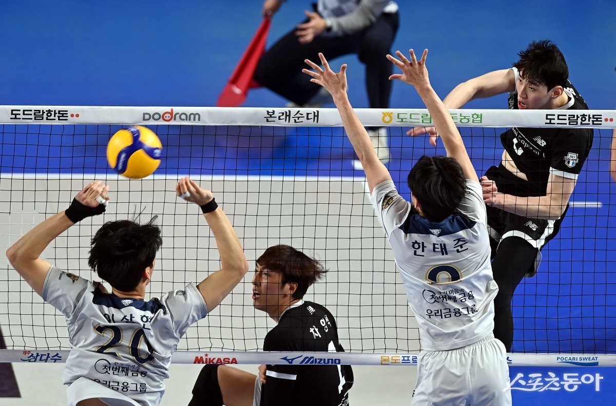12일 충남 천안유관순체육관체육관에서 ‘2023-2024 도드람 V리그’ 천안 현대캐피탈과 서울 우리카드 남자부 경기가 열렸다. 현대캐피탈 김선호가 우리카드 블로커를 피해 스파이크를 날리고 있다.