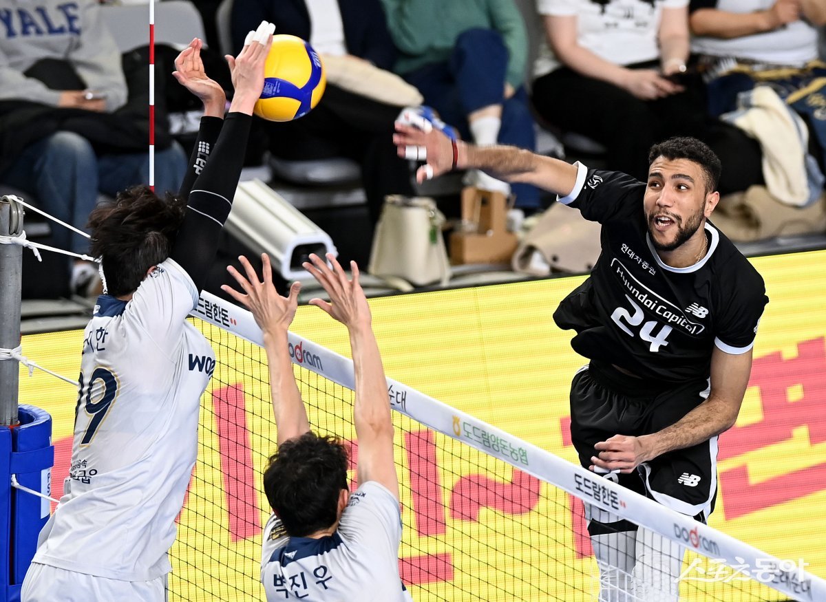 12일 충남 천안유관순체육관체육관에서 ‘2023-2024 도드람 V리그’ 천안 현대캐피탈과 서울 우리카드 남자부 경기가 열렸다. 현대캐피탈 아흐메드가 우리카드 블로커를 피해 스파이크를 날리고 있다.