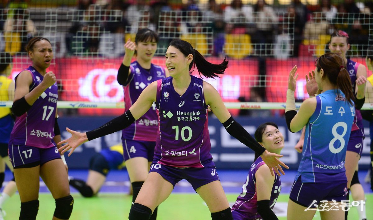12일 경기도 수원체육관에서 열린 ‘도드람 2023-2024 V리그’ 여자부 수원 현대건설과 인천 흥국생명의 경기에서 세트스코어 3-0으로 승리한 흥국생명 김연경이 기뻐하고 있다.