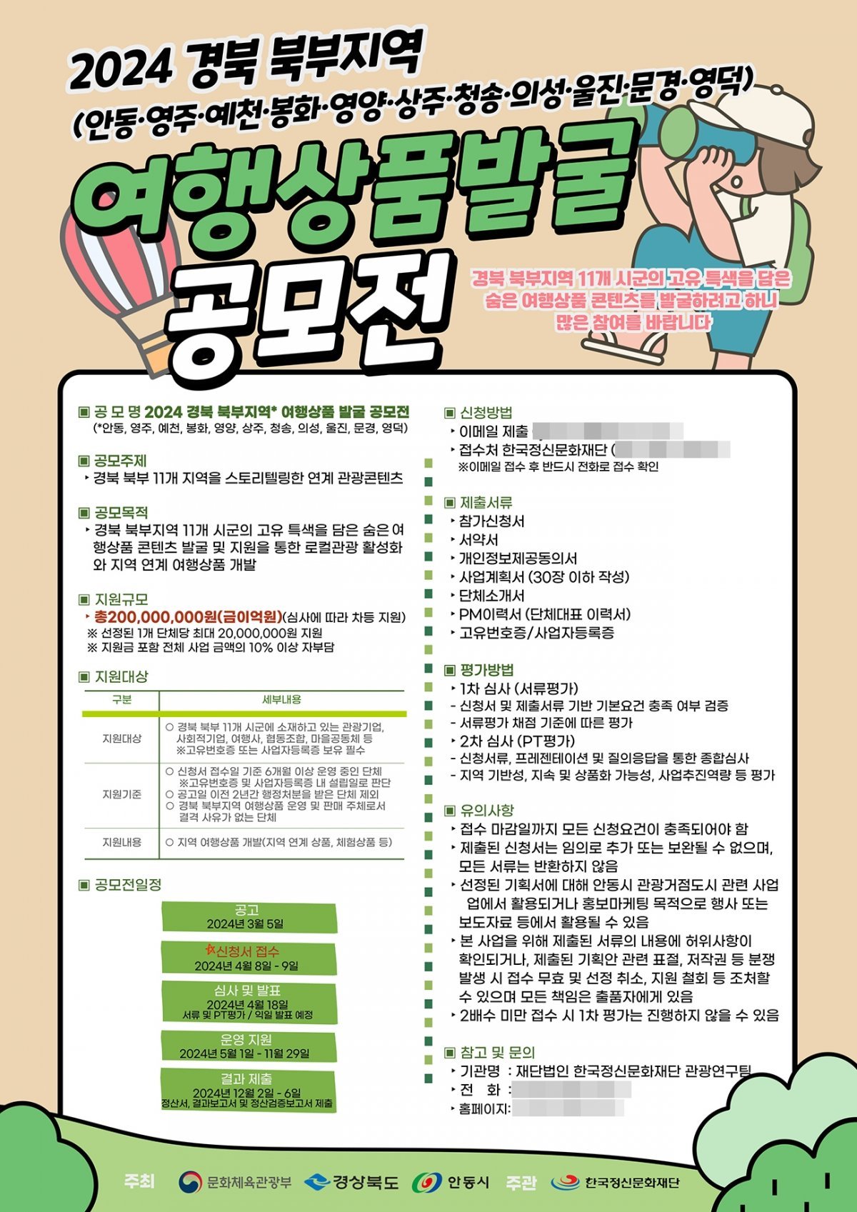 안동시와 한국정신문화재단은 ‘2024 경북 북부지역 여행상품 발굴 공모전’을 개최한다.이번 공모전은 안동, 영주, 예천, 봉화, 영양, 상주, 청송, 의성, 울진, 문경, 영덕의 매력을 충분히 살리면서 관광 트렌드를 반영한 상품이면 응모가 가능하다.