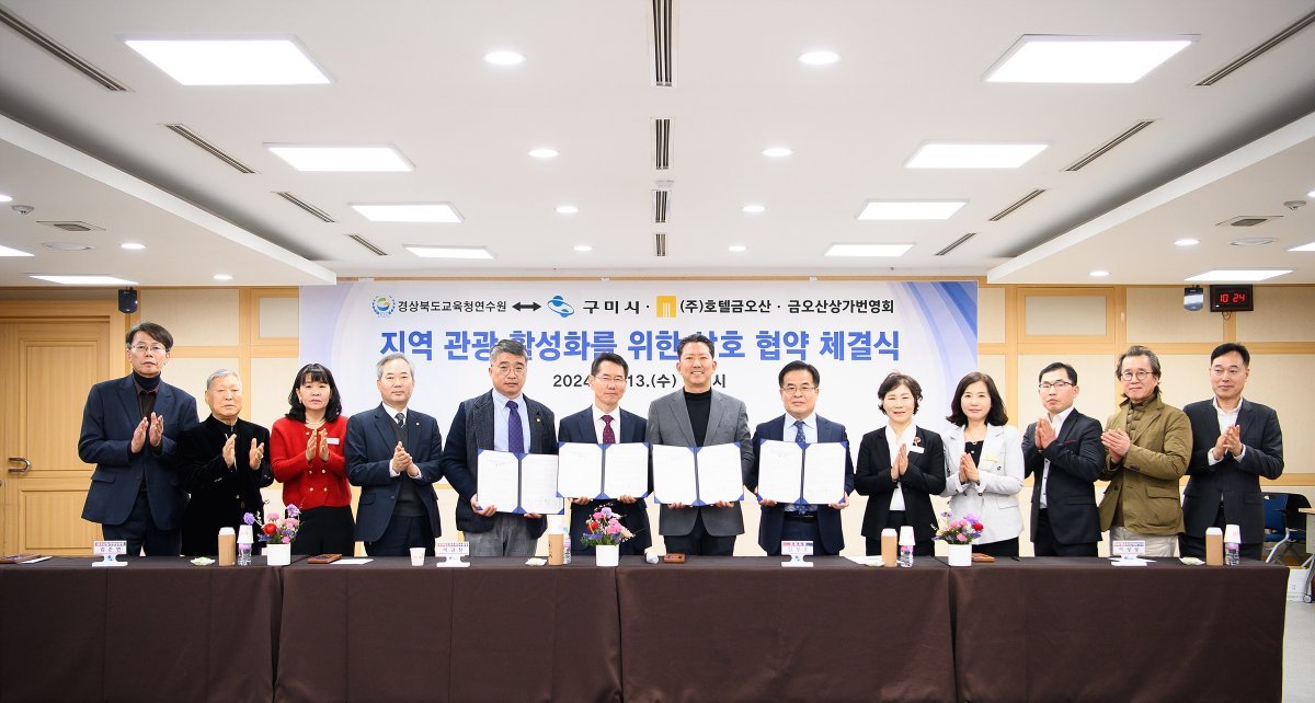 구미시는 13일 시청 대회의실에서 경상북도교육청 연수원, ㈜호텔금오산, 금오산 상가번영회, 선주원남동 도시재생지원센터, 한국외식업중앙회 구미시지부, 대한숙박업중앙회 구미시 지부 대표 등 20여 명이 참석한 가운데 지역 관광 활성화를 위한 업무 협약을 체결했다.구미 역사 문화 탐방 교육 개설 및 숙식 환경 개선