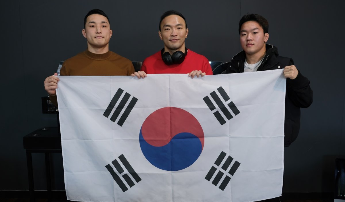 로드FC 양지용, 김수철, 이정현(왼쪽부터)은 내달 29일 일본 도쿄 아리아케 아레나에서 열리는 ‘RIZIN 46’에서 각각 일본 선수들과 한일전을 치른다. 선전을 기원하며 태극기와 함께 사진촬영에 나선 3명의 파이터. 사진제공 | 로드FC