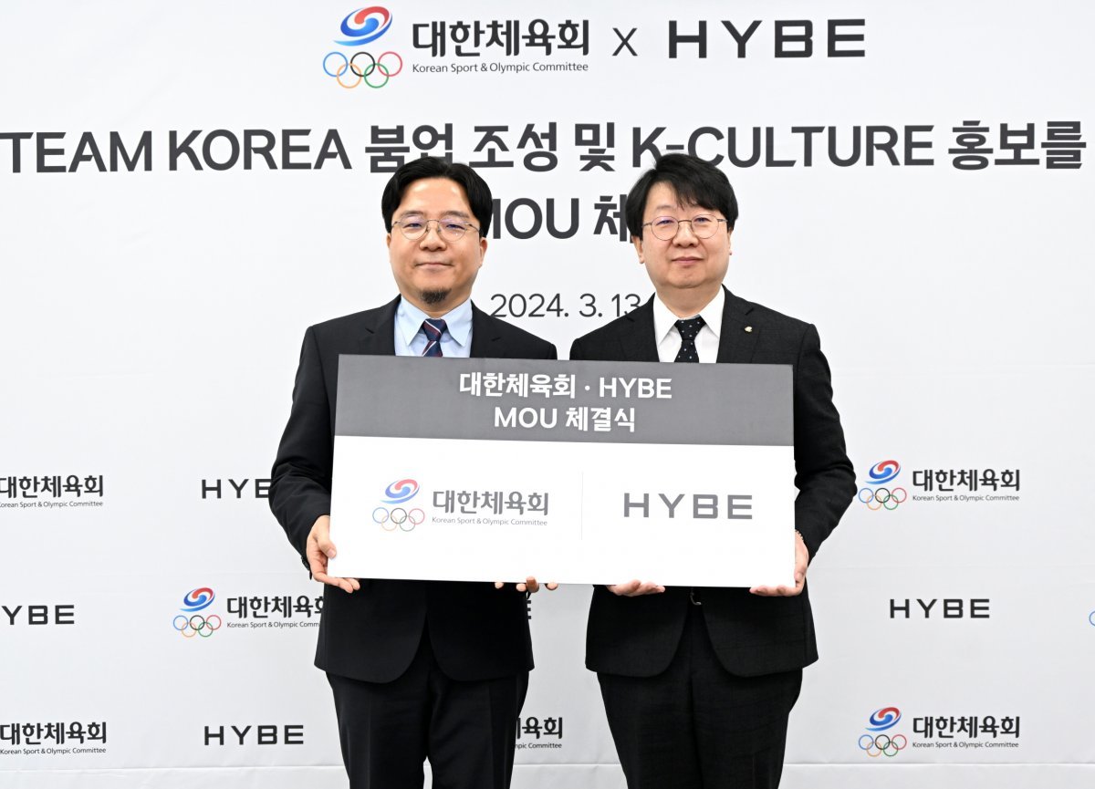 하이브가 대한체육회와 오는 7월 열리는 2024 파리올림픽 붐업과 응원 문화 선도를 위해 손을 맞잡았다