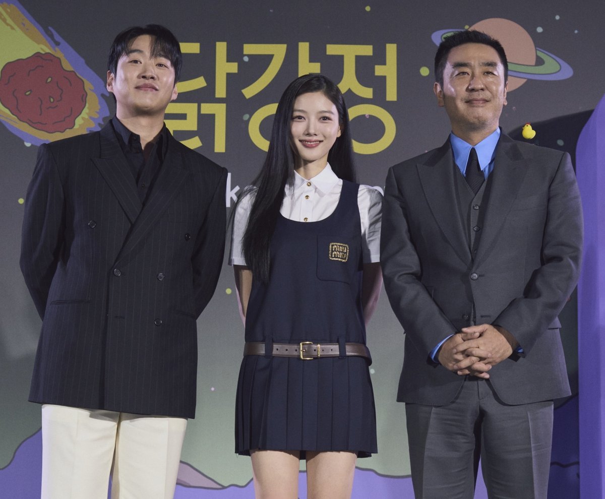 배우 안재홍, 김유정, 류승룡(왼쪽부터)이 13일 오전 서울 광진구 롯데시네마 건대입구점에서 열린 넷플릭스 드라마 ‘닭강정’ 제작발표회에서 밝은 미소와 함께 포즈를 취하고 있다. 사진제공|넷플릭스