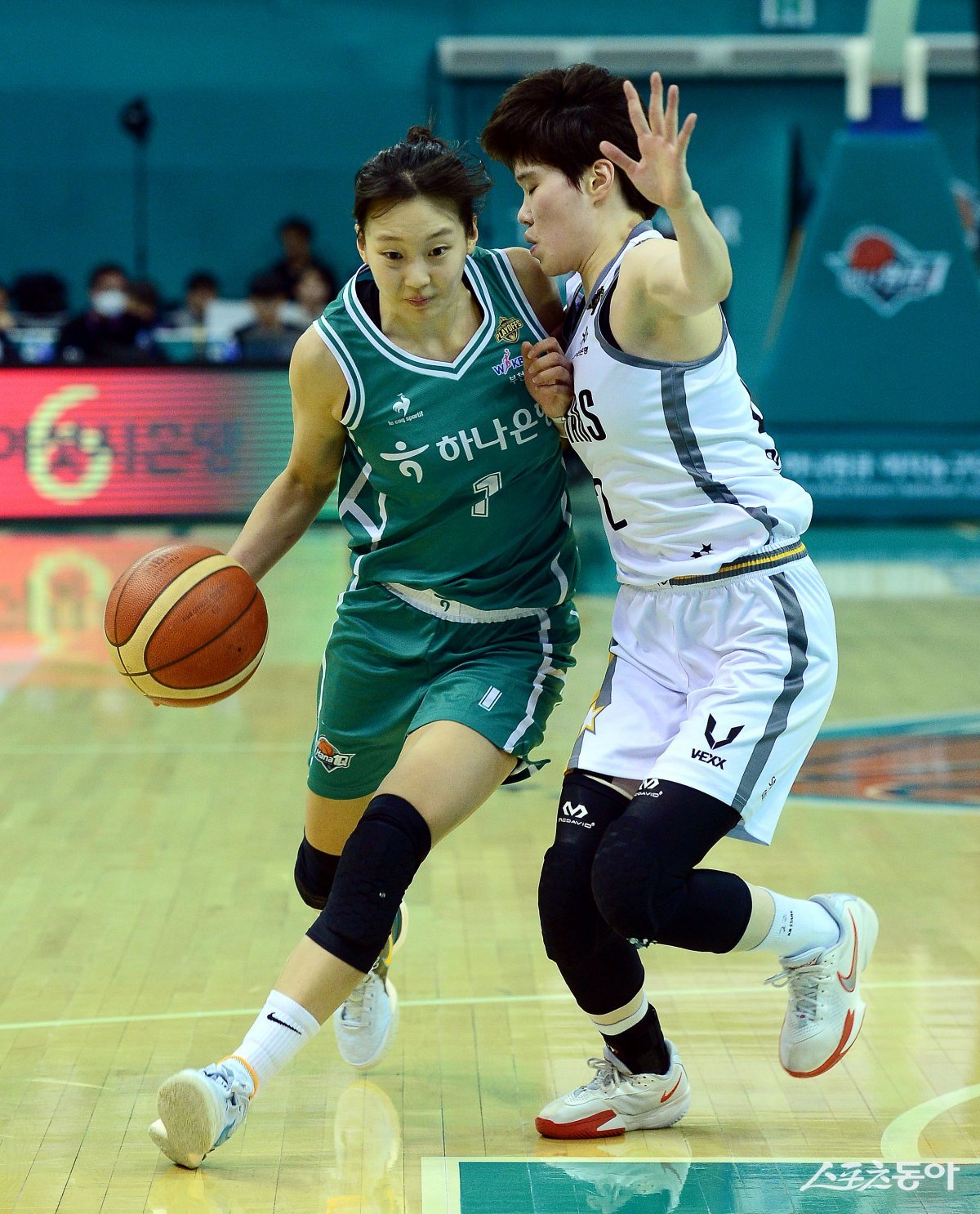 13일 경기도 부천실내체육관에서 열린 ‘우리은행 우리 WON 2023-2024 여자프로농구’ 청주 KB와 부천 하나원큐의 4강 플레이오프 경기에서 하나원큐 신지현이 KB 이혜주의 수비를 제치며 돌파를 시도하고 있다.