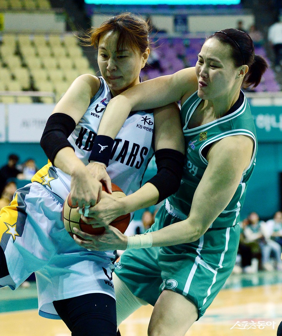 13일 경기도 부천실내체육관에서 열린 ‘우리은행 우리 WON 2023-2024 여자프로농구’ 청주 KB와 부천 하나원큐의 4강 플레이오프 경기에서 KB 염윤아와 하나원큐 김정은이 리바운드를 다투고 있다.