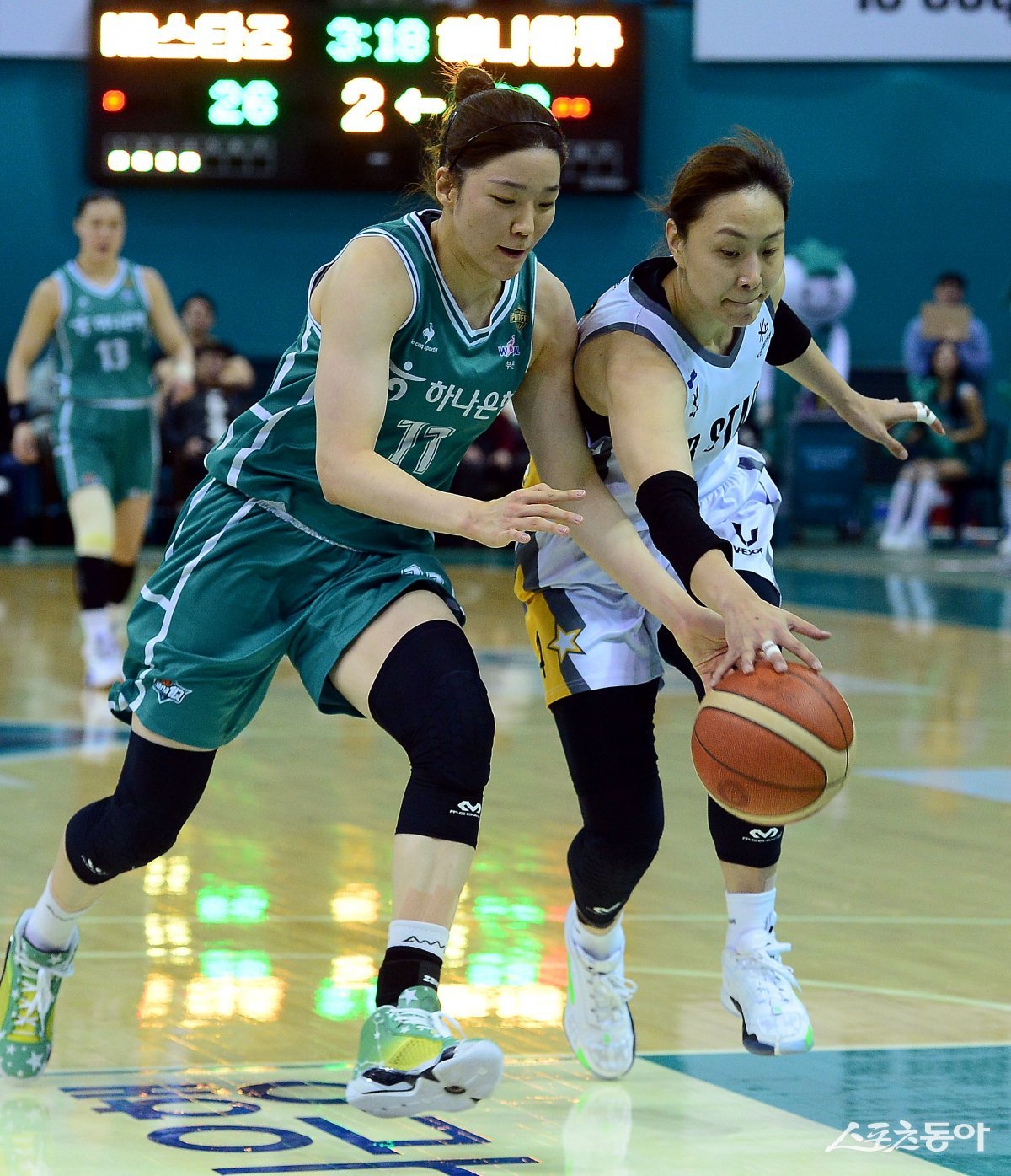 13일 경기도 부천실내체육관에서 열린 ‘우리은행 우리 WON 2023-2024 여자프로농구’ 청주 KB와 부천 하나원큐의 4강 플레이오프 경기에서 하나원큐 양인영과 KB 염윤아가 볼 다툼을 벌이고 있다.