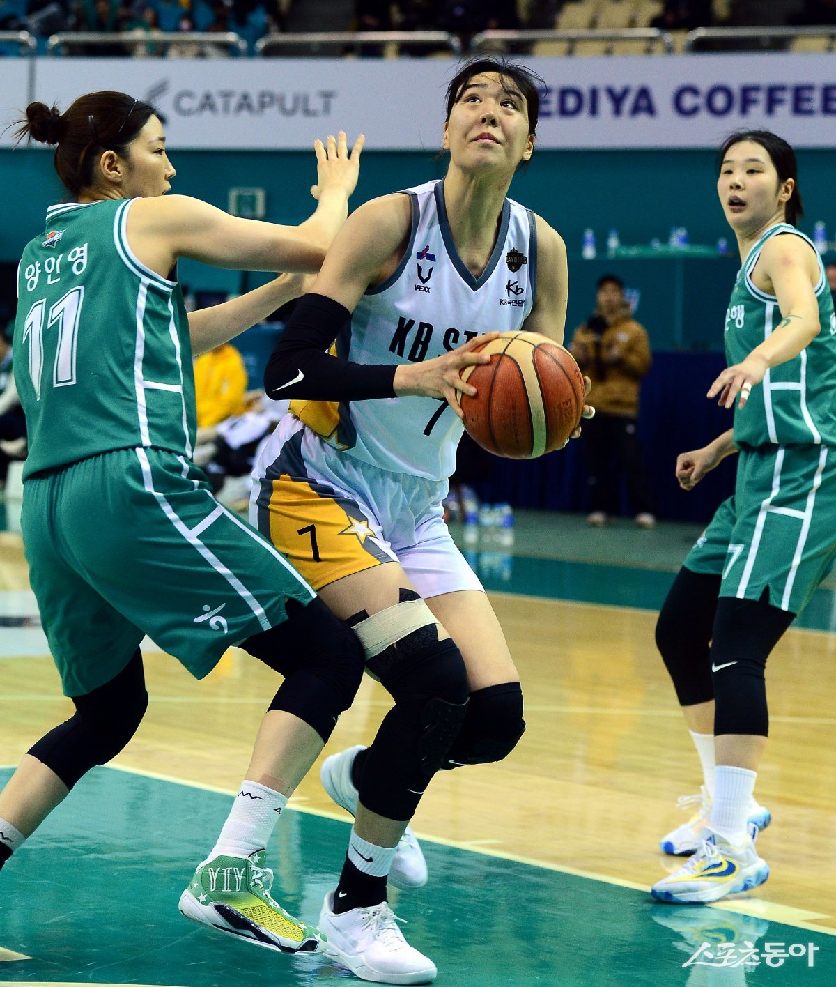 13일 경기도 부천실내체육관에서 열린 ‘우리은행 우리 WON 2023-2024 여자프로농구’ 청주 KB와 부천 하나원큐의 4강 플레이오프 경기에서 KB 박지수가 하나원큐 양인영의 수비를 피해 슛을 시도하고 있다.