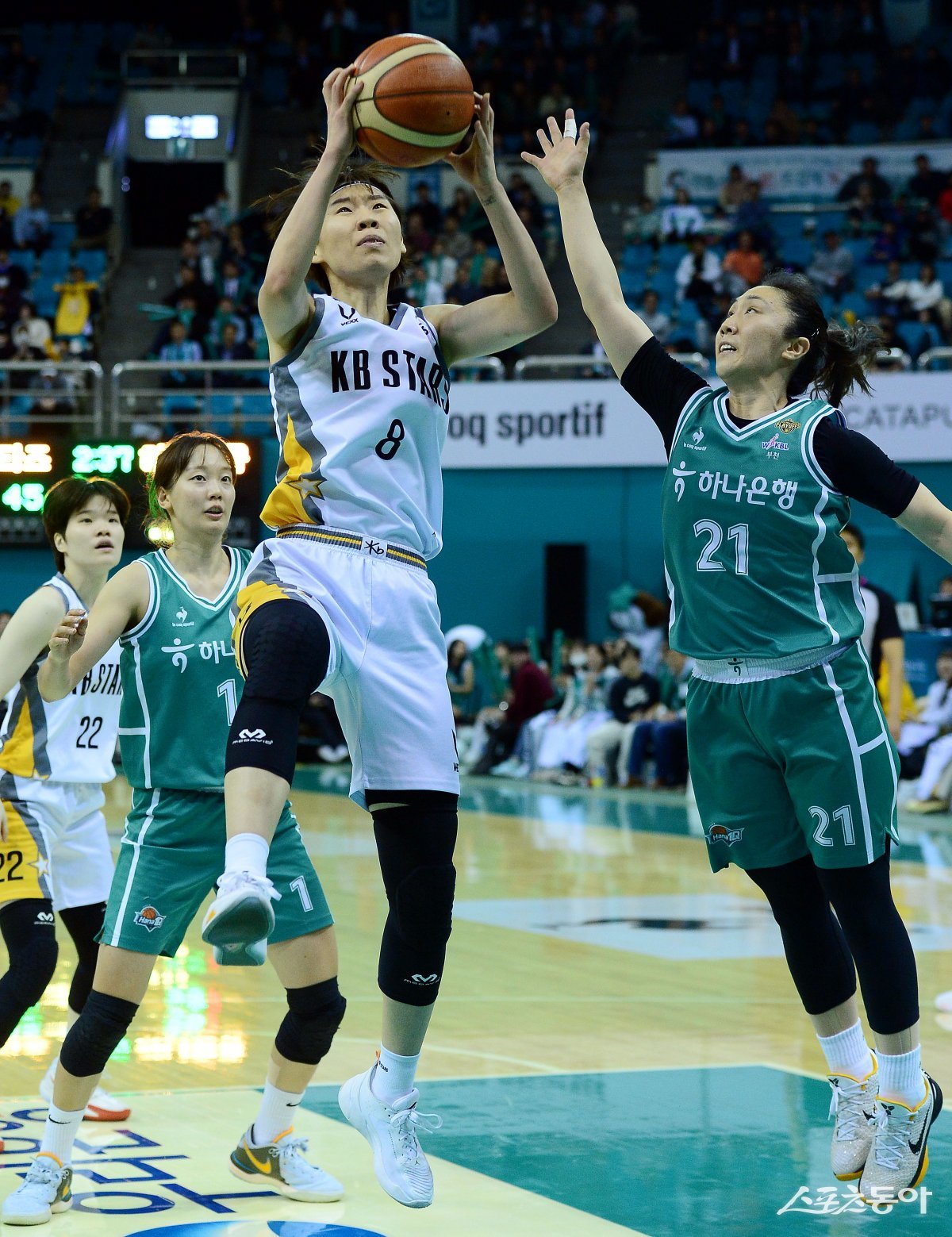 13일 경기도 부천실내체육관에서 열린 ‘우리은행 우리 WON 2023-2024 여자프로농구’ 청주 KB와 부천 하나원큐의 4강 플레이오프 경기에서 KB 김민정이 하나원큐 김애나의 수비를 피해 슛을 쏘고 있다.