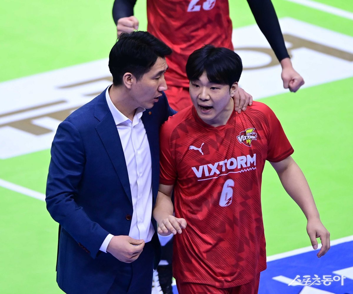 13일 경기도 수원체육관에서 열린 ‘도드람 2023-2024 V리그’ 남자부 수원 한국전력과 대전 삼성화재의 경기에서 한국전력 권영민 감독과 하승우가 이야기를 하고 있다. 수원 | 주현희 기자 teth1147@donga.com