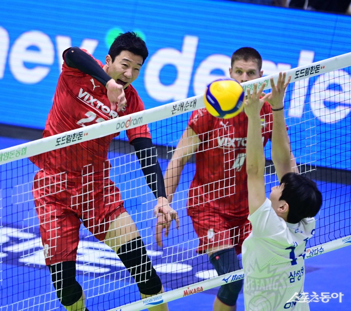 13일 경기도 수원체육관에서 열린 ‘도드람 2023-2024 V리그’ 남자부 수원 한국전력과 대전 삼성화재의 경기에서 한국전력 신영석이 삼성화재 블로커 앞에서 스파이크를 하고 있다. 수원 | 주현희 기자 teth1147@donga.com