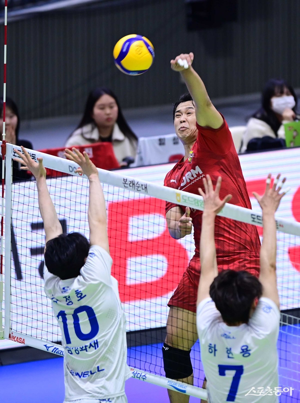 13일 경기도 수원체육관에서 열린 ‘도드람 2023-2024 V리그’ 남자부 수원 한국전력과 대전 삼성화재의 경기에서 한국전력 서재덕이 삼성화재 블로커 앞에서 스파이크를 하고 있다. 수원 | 주현희 기자 teth1147@donga.com