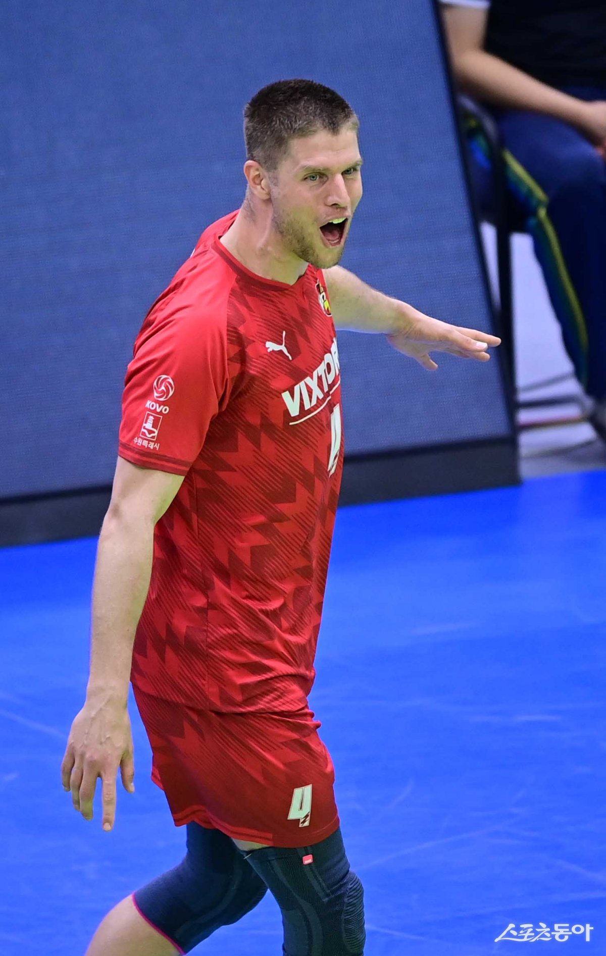 13일 경기도 수원체육관에서 열린 ‘도드람 2023-2024 V리그’ 남자부 수원 한국전력과 대전 삼성화재의 경기에서 서브 득점에 성공한 한국전력 타이스가 기뻐하고 있다. 수원 | 주현희 기자 teth1147@donga.com