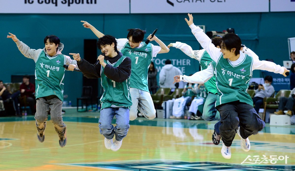 13일 경기도 부천실내체육관에서 열린 ‘우리은행 우리 WON 2023-2024 여자프로농구’ 청주 KB와 부천 하나원큐의 4강 플레이오프 경기에서 보이그룹 ATBO가 축하공연을 펼치고 있다.
