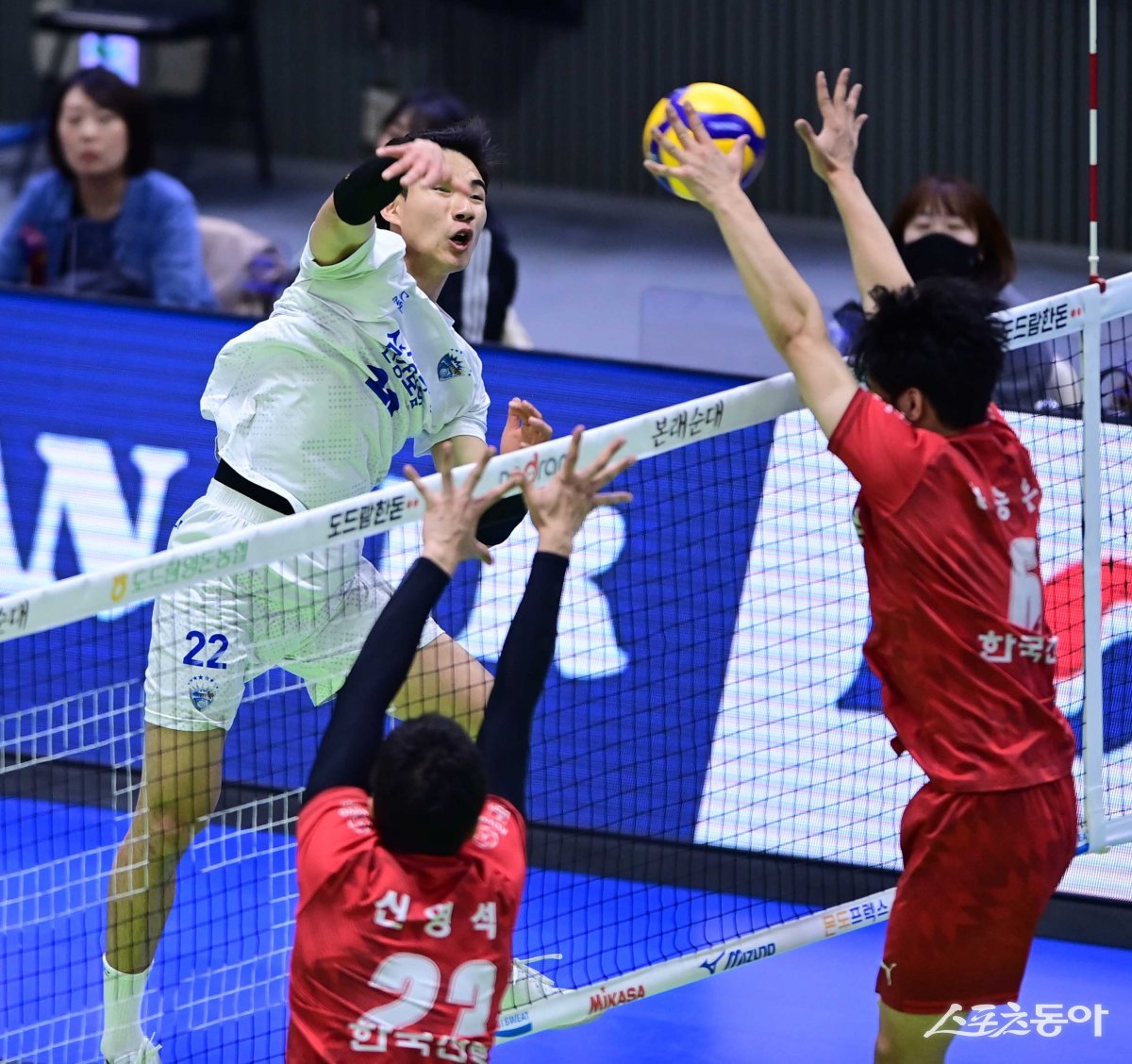 13일 경기도 수원체육관에서 열린 ‘도드람 2023-2024 V리그’ 남자부 수원 한국전력과 대전 삼성화재의 경기에서 삼성화재 김우진이 한국전력 블로커 앞에서 스파이크를 하고 있다.