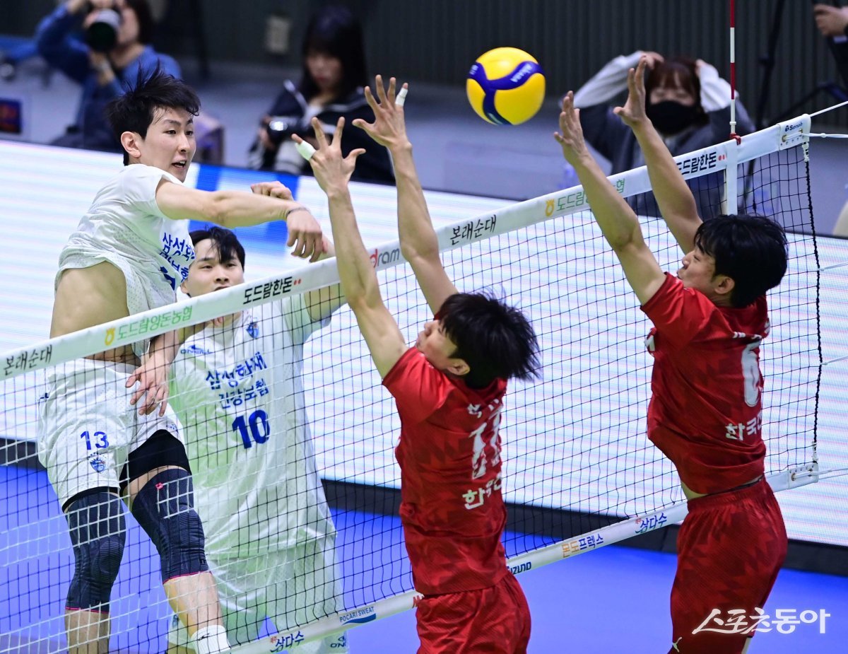 13일 경기도 수원체육관에서 열린 ‘도드람 2023-2024 V리그’ 남자부 수원 한국전력과 대전 삼성화재의 경기에서 삼성화재 김준우가 한국전력 블로커 앞에서 스파이크를 하고 있다.