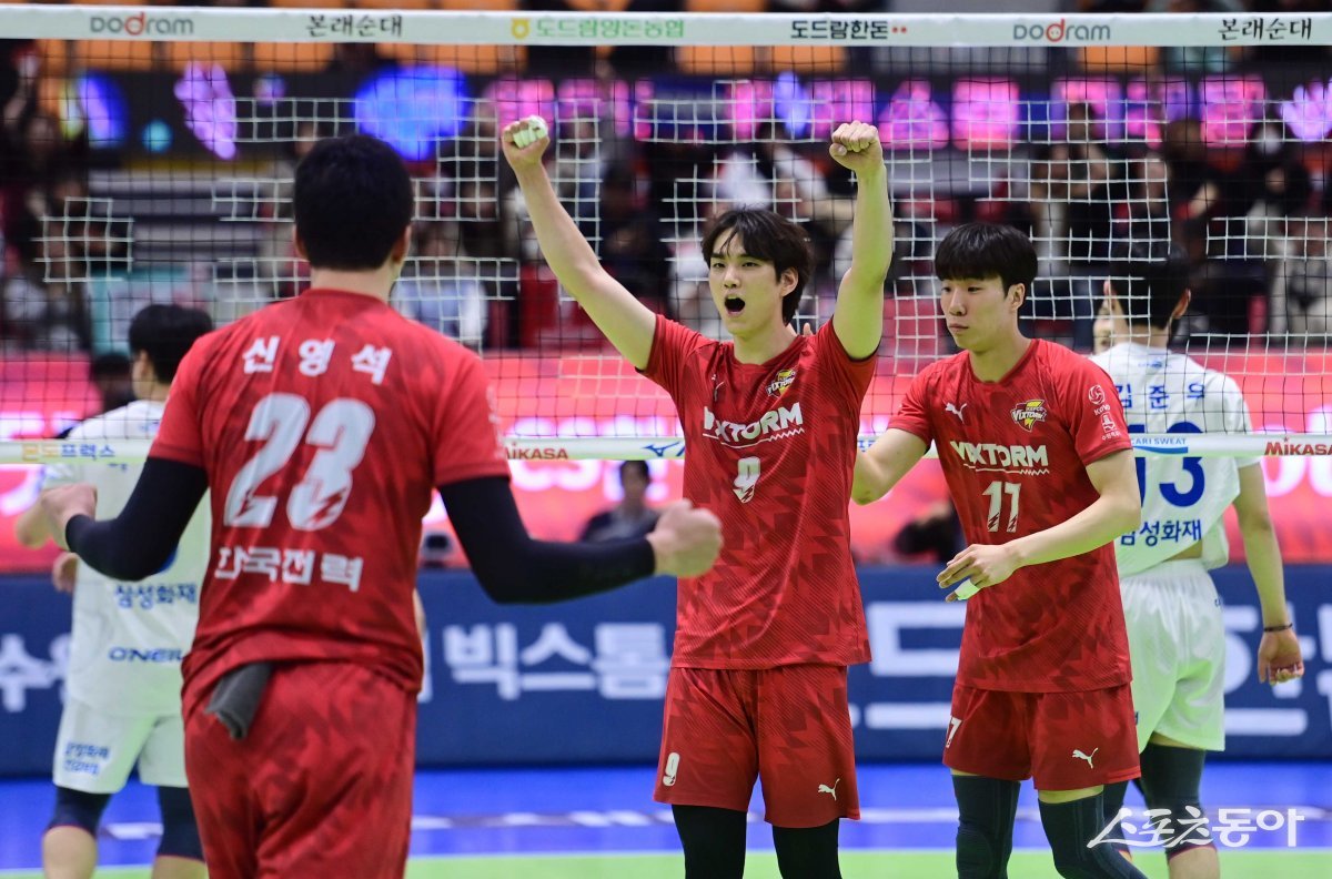 13일 경기도 수원체육관에서 열린 ‘도드람 2023-2024 V리그’ 남자부 수원 한국전력과 대전 삼성화재의 경기에서 세트스코어 3-1로 승리한 한국전력 임성진이 세리머니를 하고 있다.
