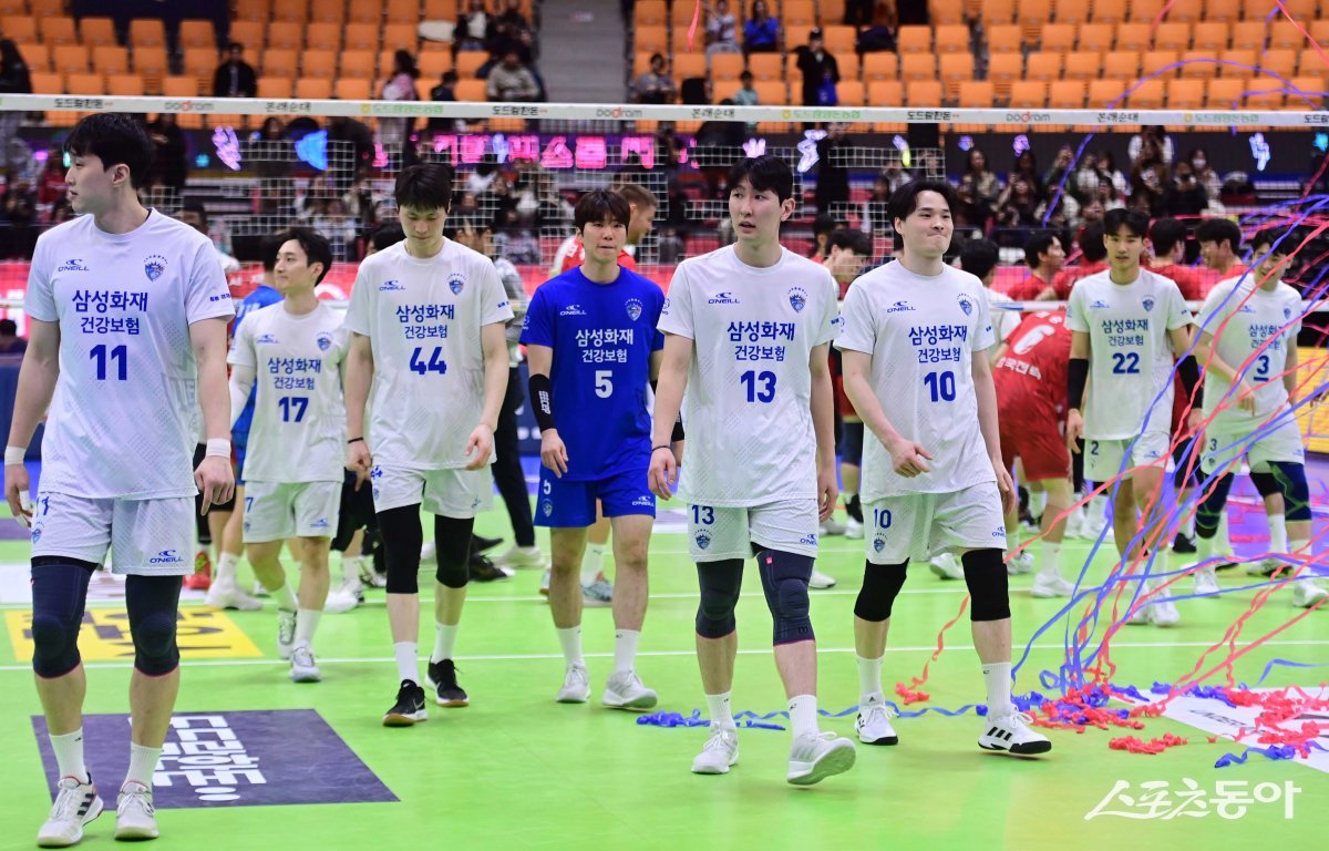 13일 경기도 수원체육관에서 열린 ‘도드람 2023-2024 V리그’ 남자부 수원 한국전력과 대전 삼성화재의 경기에서 세트스코어 1-3으로 패한 삼성화재 선수들이 아쉬워하고 있다.
