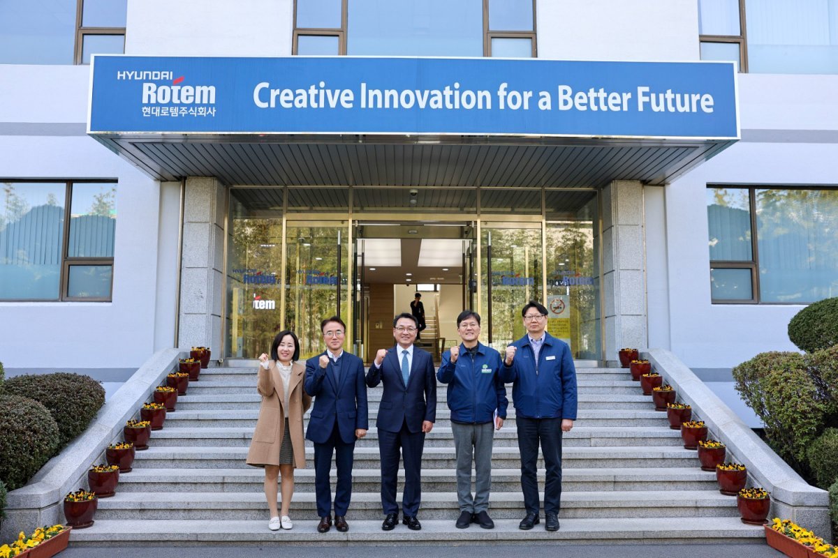 장웅요 부산본부세관장(가운데)이 13일 오후 현대로템㈜ 창원공장을 방문한 가운데 관계자들과 기념촬영을 하고 있다. 사진제공ㅣ부산본부세관