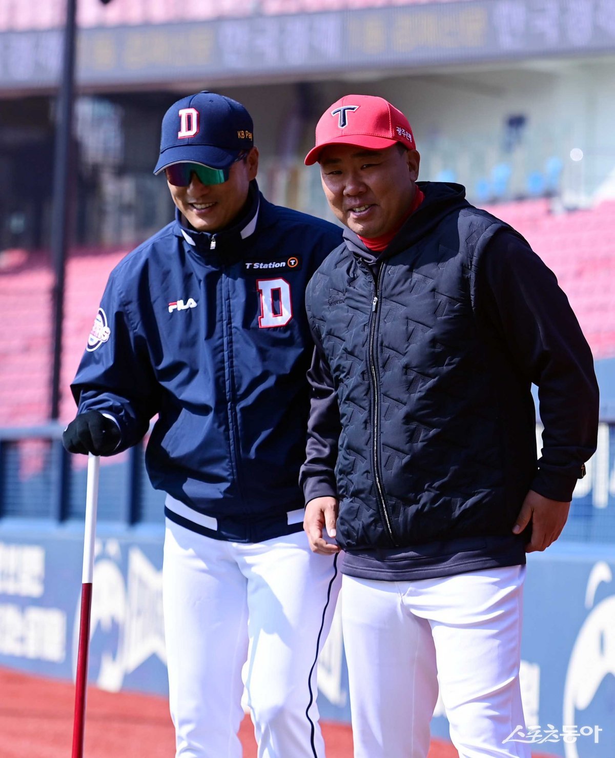 14일 서울 잠실야구장에서 열린 ‘2024 신한 SOL 뱅크 KBO리그’ 두산 베어스와 KIA 타이거즈의 시범경기에 앞서 두산 이승엽 감독과 KIA 이범호 감독이 이야기를 하고 있다.
